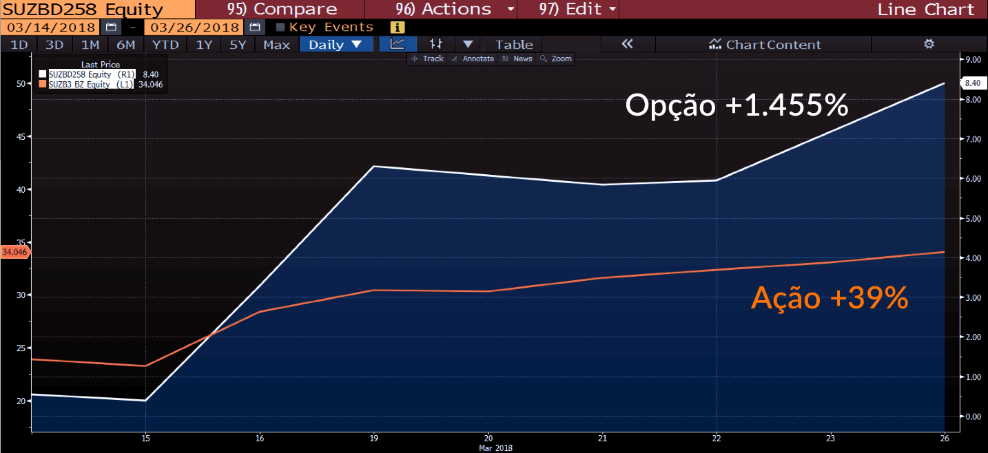 É um exemplo clássico de como opções podem alavancar seus ganhos quando a ação está em alta.