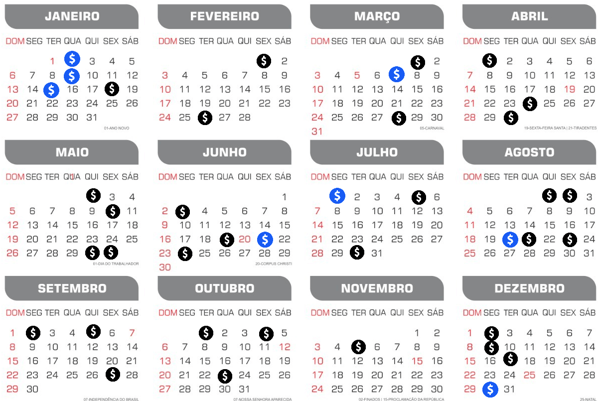 No dia 7 de março, 3 pagamentos. Em 21 de junho? Mais 3 também.