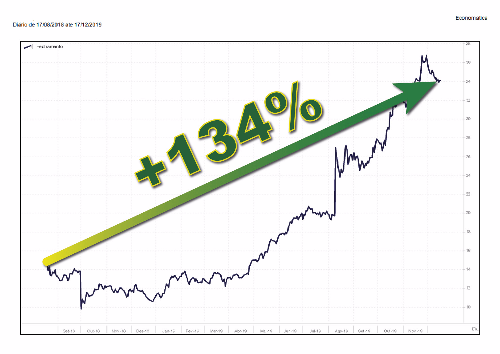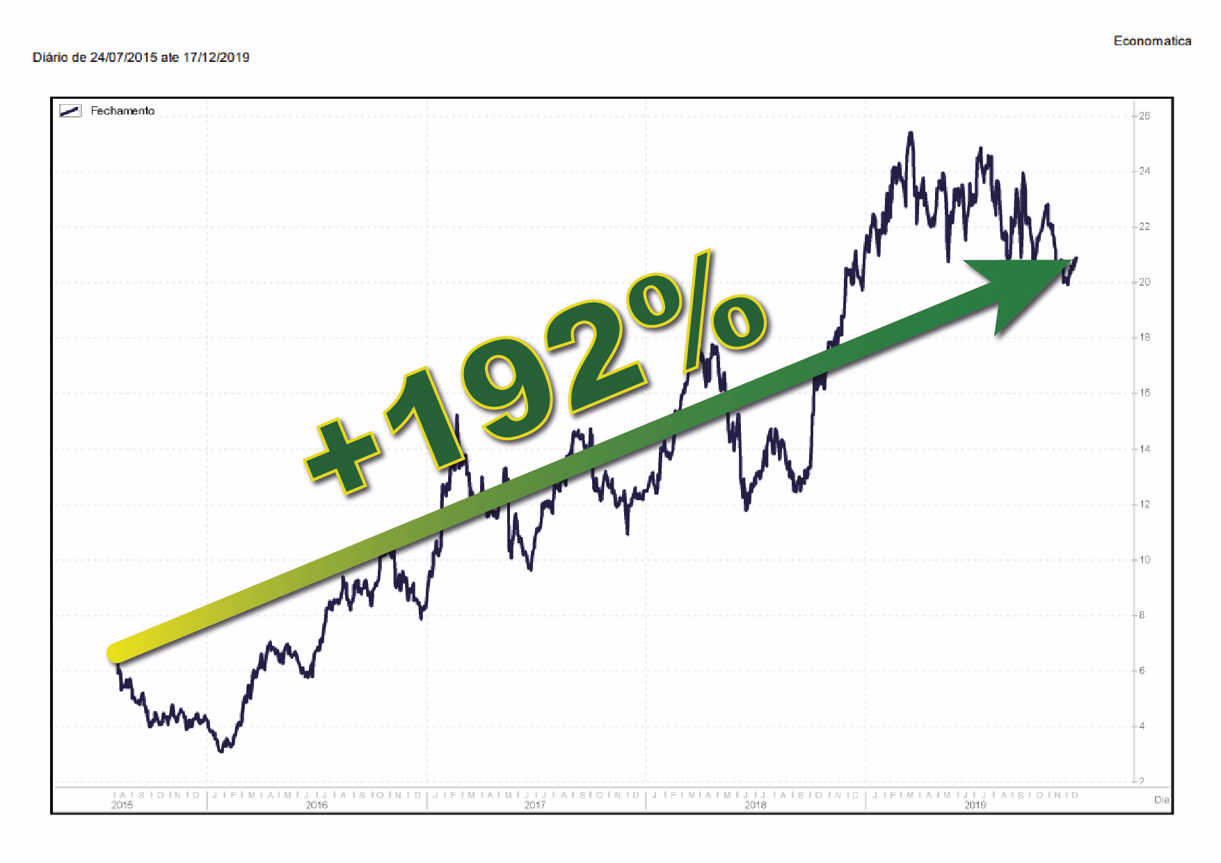 Para você ter ideia de quanto isso significa, o Ibovespa, índice que mede o desempenho da Bolsa, foi de +125% no mesmo período.
