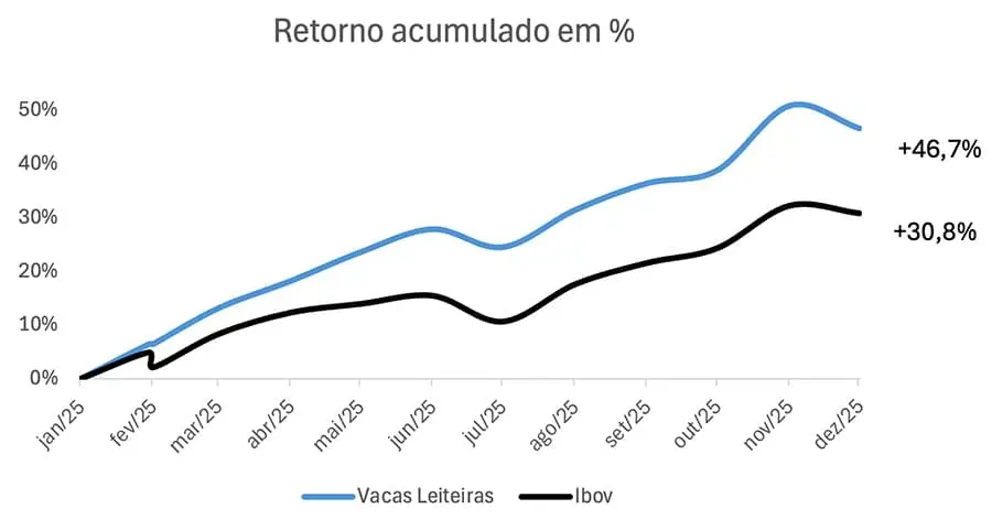 Fonte: elaboração Empiricus com dados da Bloomberg. Desempenho da carteira Vacas Leiteiras de 01/01/2025 a 05/12/2025.